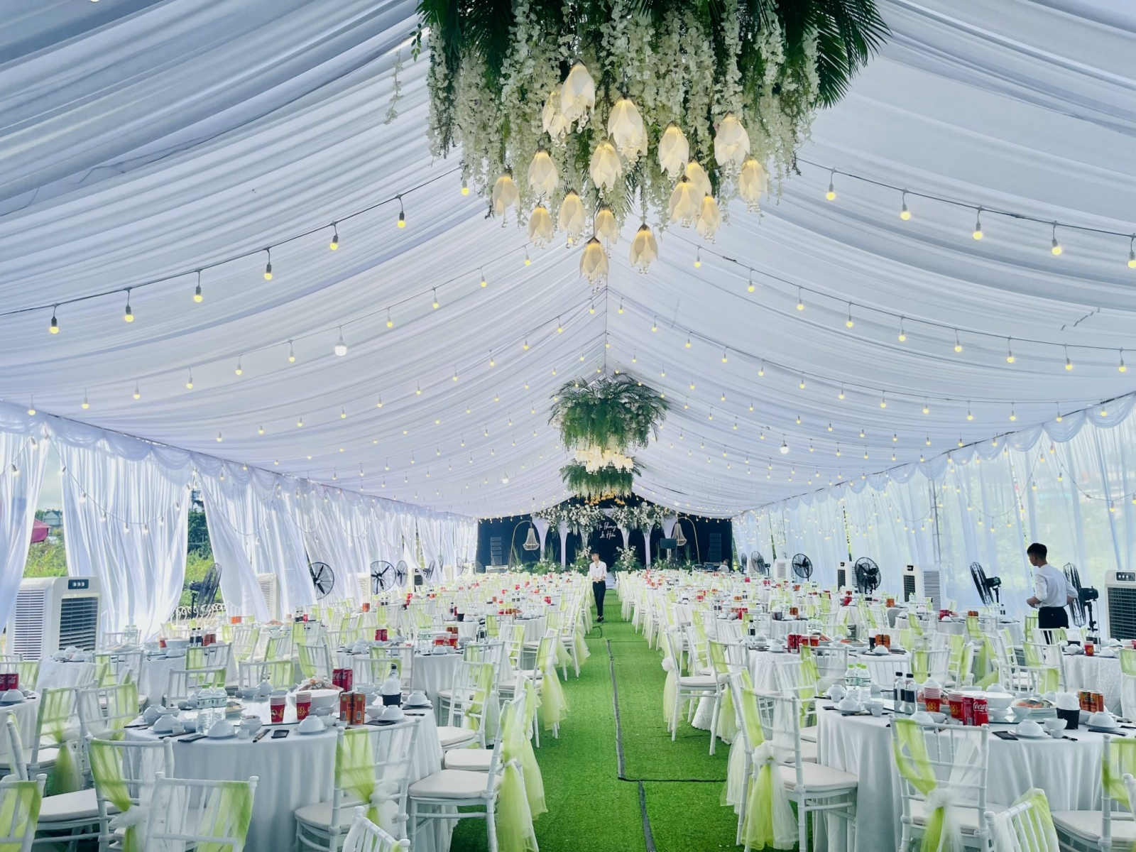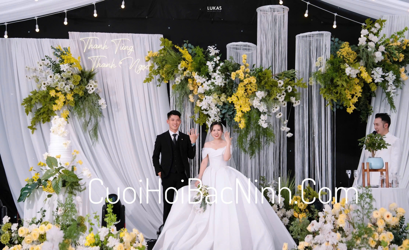 Không gian sân khấu chính nổi bật với phông nền vải trắng mềm mại, kết hợp cùng hệ thống dây treo thẳng, đèn led chữ nghệ thuật và hàng trăm đóa hoa tươi tone vàng, trắng, điểm xanh tạo cảm giác tươi sáng và ấm áp. Cặp đôi đã có những khoảnh khắc đáng nhớ bên nhau, giữa khung cảnh ngập tràn hoa lá và ánh đèn lung linh.