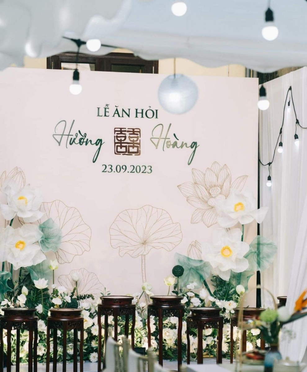 | Phông nền gia tiên | Vải lụa, nhung hoặc lụa trơn, treo backdrop hoa, chữ song hỷ hoặc tên CD–CR |