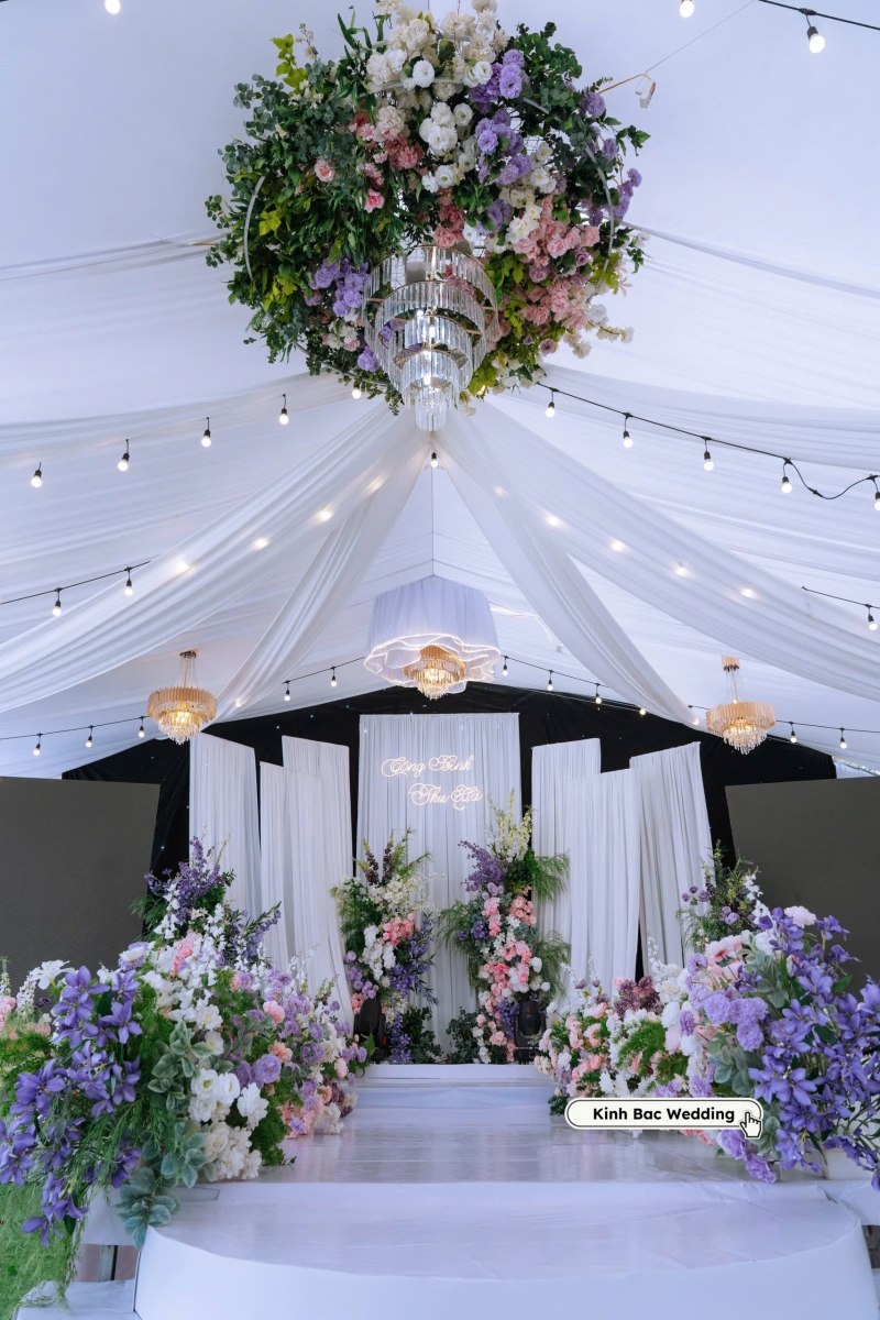 Với lợi thế sân trường rộng rãi, không bị giới hạn về không gian, đội ngũ Kinh Bắc Wedding đã thiết kế một không gian cưới mang tone trắng – tím pastel – hồng phấn, tạo nên tổng thể mềm mại, nhẹ nhàng nhưng vẫn vô cùng nổi bật. Phần mái che được dựng chắc chắn, sử dụng vải voan trắng kết hợp đèn led, tạo nên hiệu ứng ánh sáng lung linh cả ngày lẫn đêm.