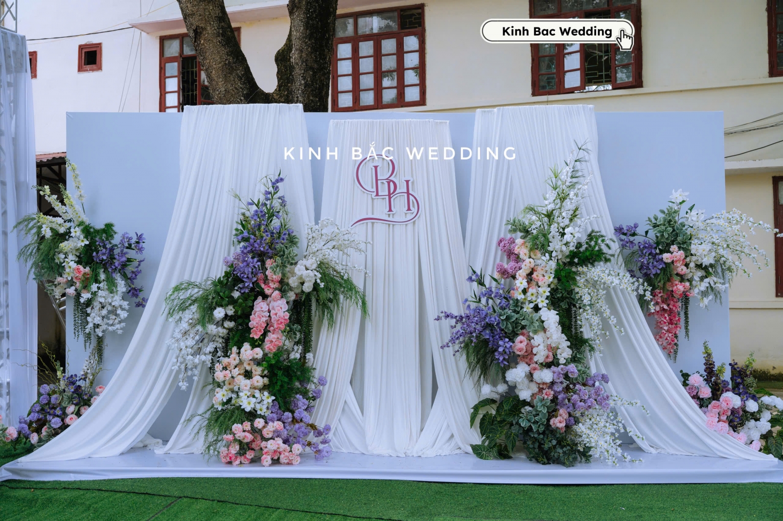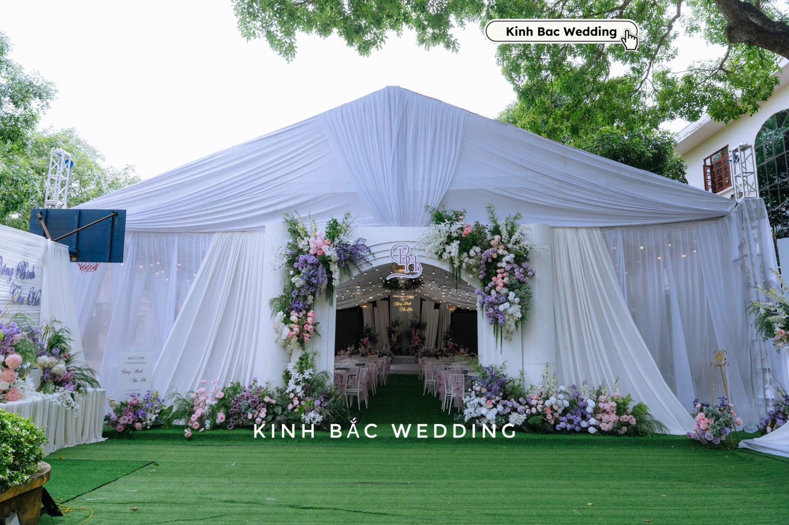 Một điểm đặc biệt trong đám cưới tại sân trường xã Lục Nam lần này chính là thiết kế cổng hoa và photobooth. Cổng chính được dựng bằng khung vòm lớn, phủ kín hoa tươi tone tím – trắng – xanh lá, vừa mềm mại, vừa hiện đại. Logo lồng tên cô dâu chú rể nổi bật giữa nền vải trắng, làm tăng tính cá nhân hoá và dấu ấn riêng cho buổi lễ.