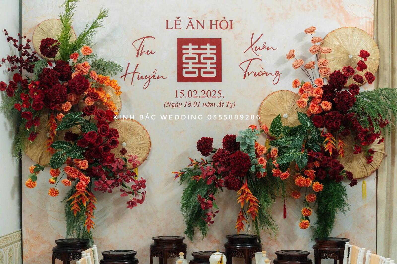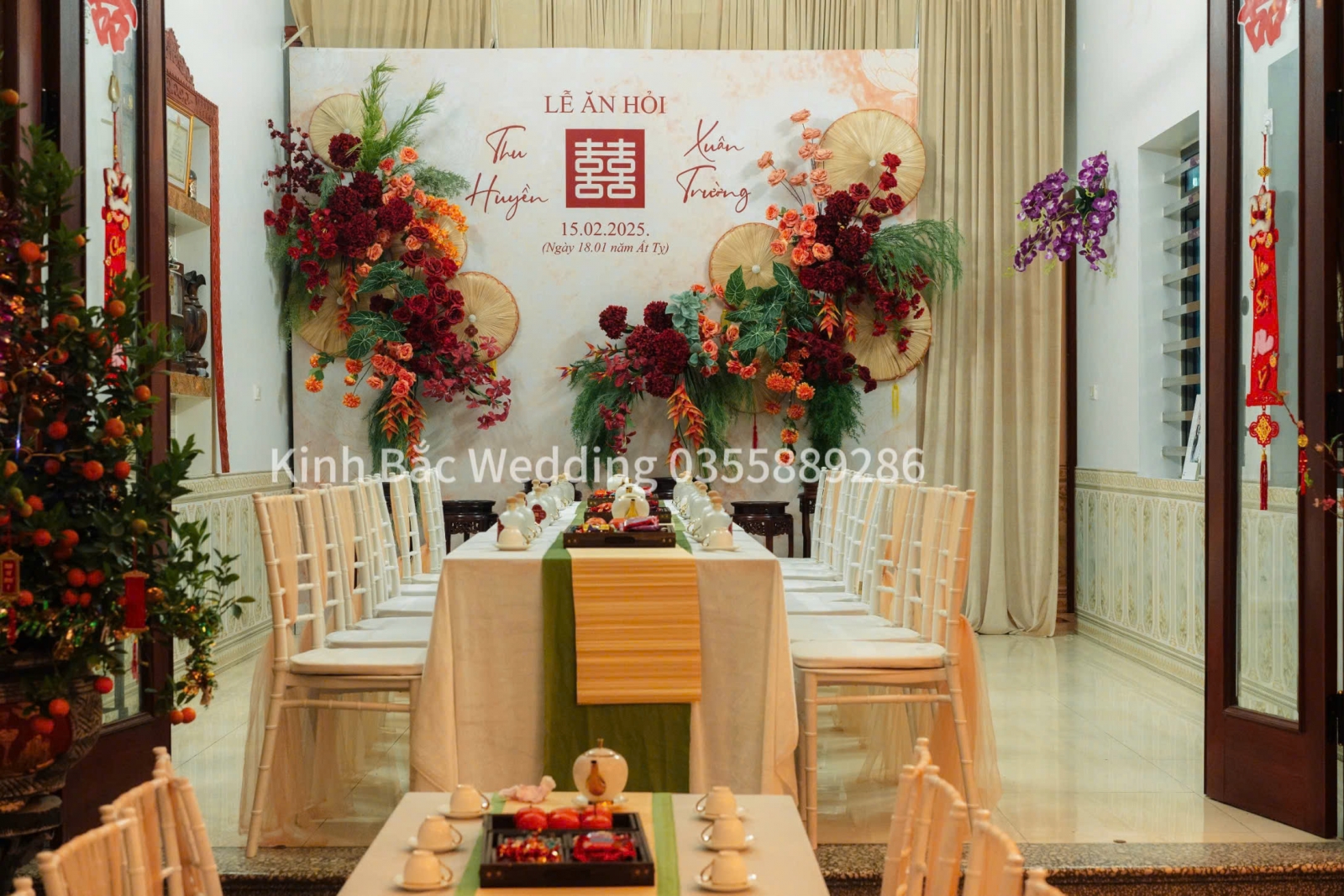 Không gian được thiết kế với phông backdrop mang họa tiết thư pháp mềm mại cùng chữ "Hỷ" cách điệu, kết hợp với hoa tươi nổi bật. Bàn gia tiên được bài trí trang trọng với lễ vật truyền thống, hoa sen và nến đỏ tạo điểm nhấn trang nghiêm. Hệ thống ghế và bàn tiệc được trang trí bằng khăn lụa đồng màu, mang lại cảm giác sang trọng và hài hòa.