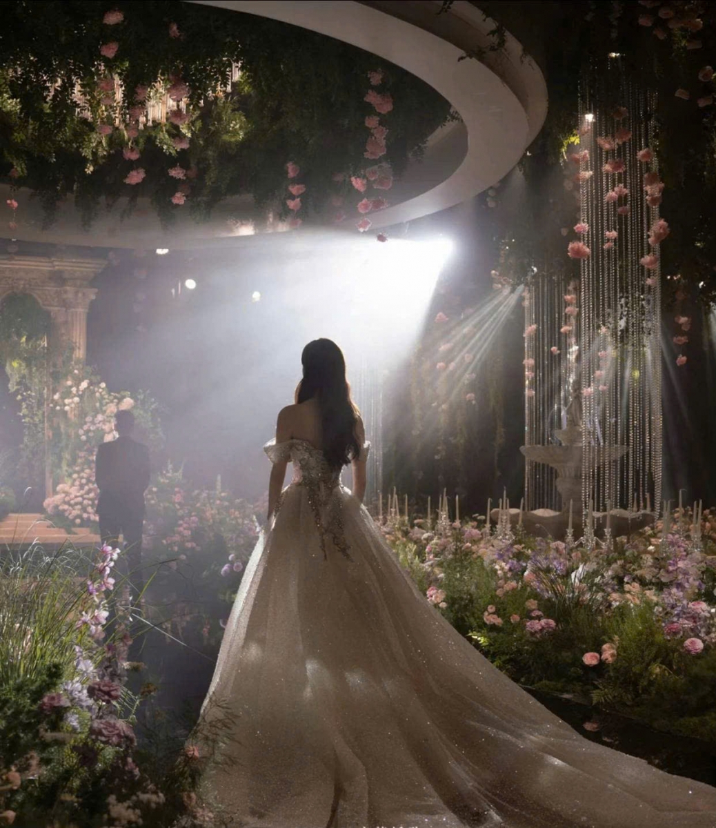 Phông cưới phía trong kết hợp ánh sáng và vải lụa mềm.