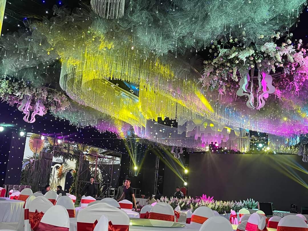 Rạp cưới tone trắng – vàng hoặc pastel, có trần voan mềm mại và đèn led lung linh.