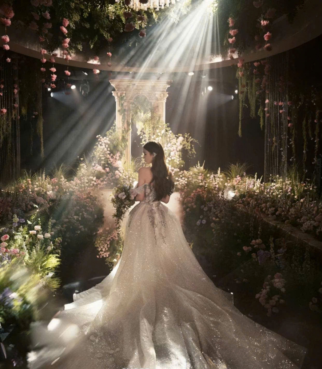 Phông cưới hiện đại: nền vải, backdrop mica, đèn chiếu sáng hợp không gian.