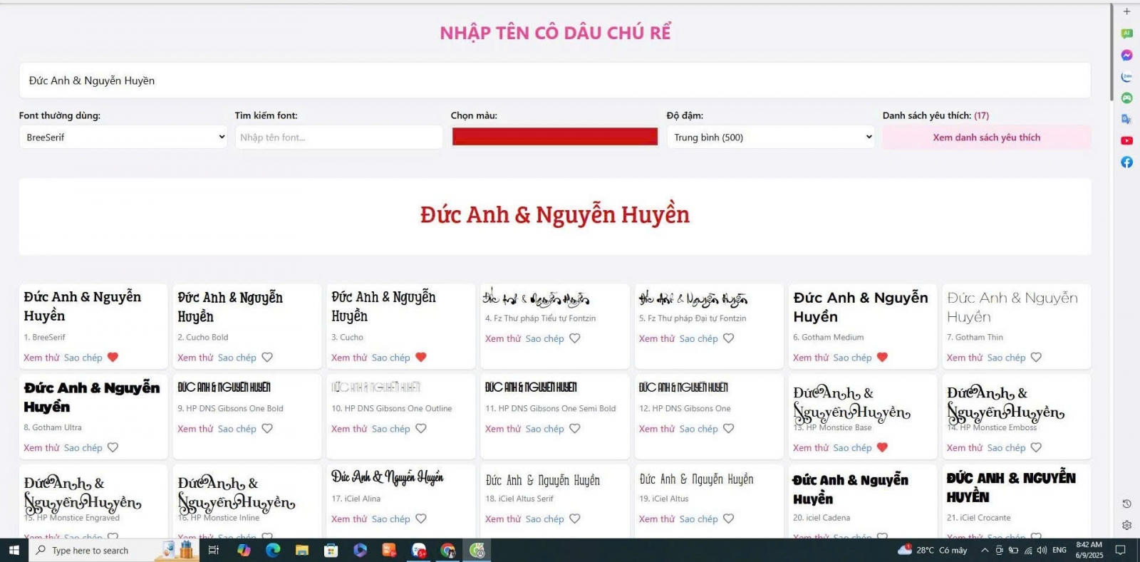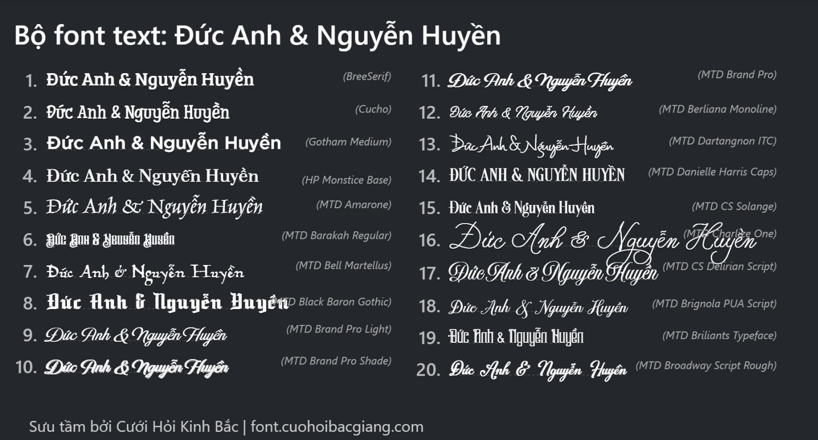 Đây là nền tảng trực tuyến cho phép bạn nhập nội dung tùy chỉnh (ví dụ: tên cô dâu chú rể) và hiển thị ngay hàng trăm mẫu font chữ khác nhau để xem trước. Tất cả được trình bày trực quan, dễ hiểu và hỗ trợ cả tiếng Việt có dấu.